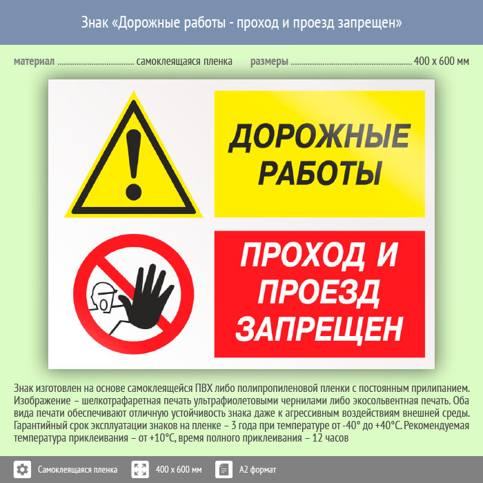 Знак «Дорожные работы - проход и проезд запрещен», КЗ-20 (пленка, 600х400 мм) в Твери купить