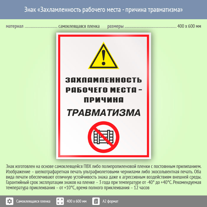 Знак «Захламленность рабочего места - причина травматизма», КЗ-21 (пленка, 400х600 мм) в Твери купить
