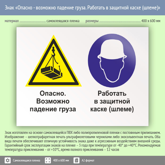 Знак «Опасно - возможно падение груза. Работать в защитной каске (шлеме)», КЗ-34 (пленка, 600х400 мм) в Твери купить