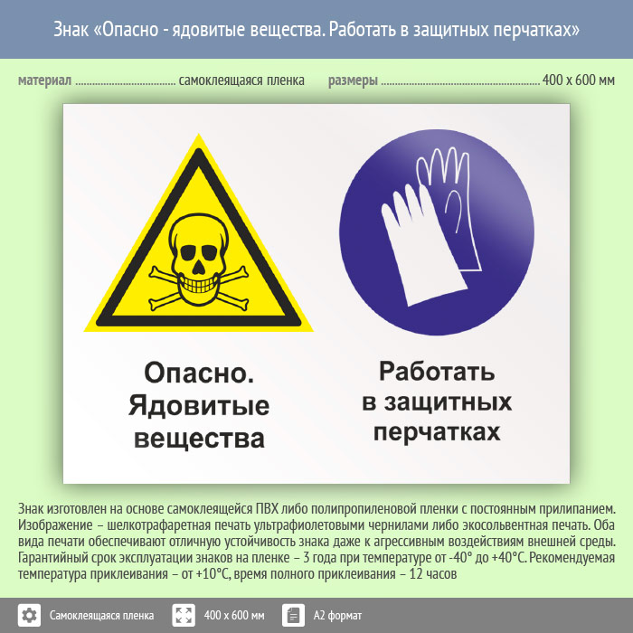 Знак «Опасно - ядовитые вещества. Работать в защитных перчатках», КЗ-43 (пленка, 600х400 мм) в Твери купить
