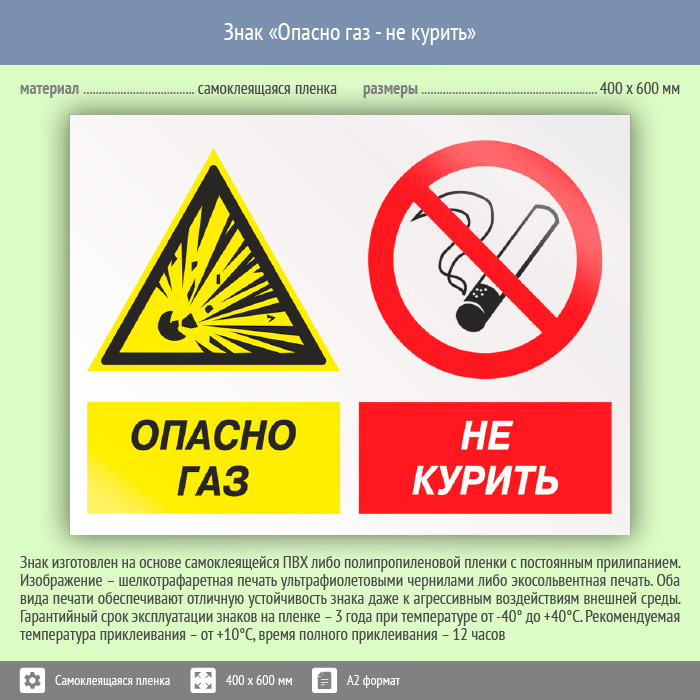Знак «Опасно газ - не курить», КЗ-44 (пленка, 600х400 мм) в Твери купить