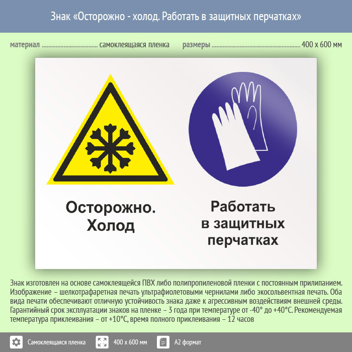 Знак «Осторожно - холод. Работать в защитных перчатках», КЗ-59 (пленка, 600х400 мм) в Твери купить