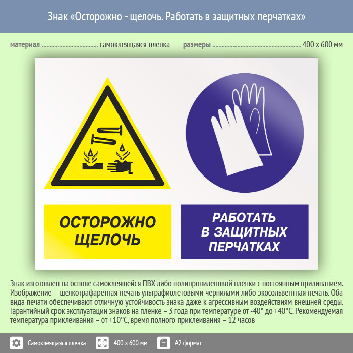 Знак «Осторожно - щелочь. Работать в защитных перчатках», КЗ-60 (пленка, 600х400 мм) в Твери купить