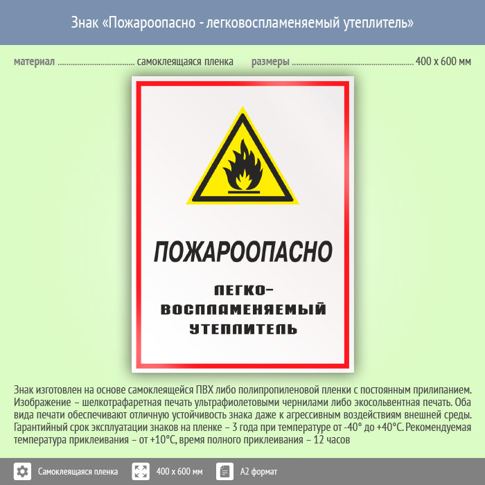 Знак «Пожароопасно - легковоспламеняемый утеплитель», КЗ-68 (пленка, 400х600 мм) в Твери купить