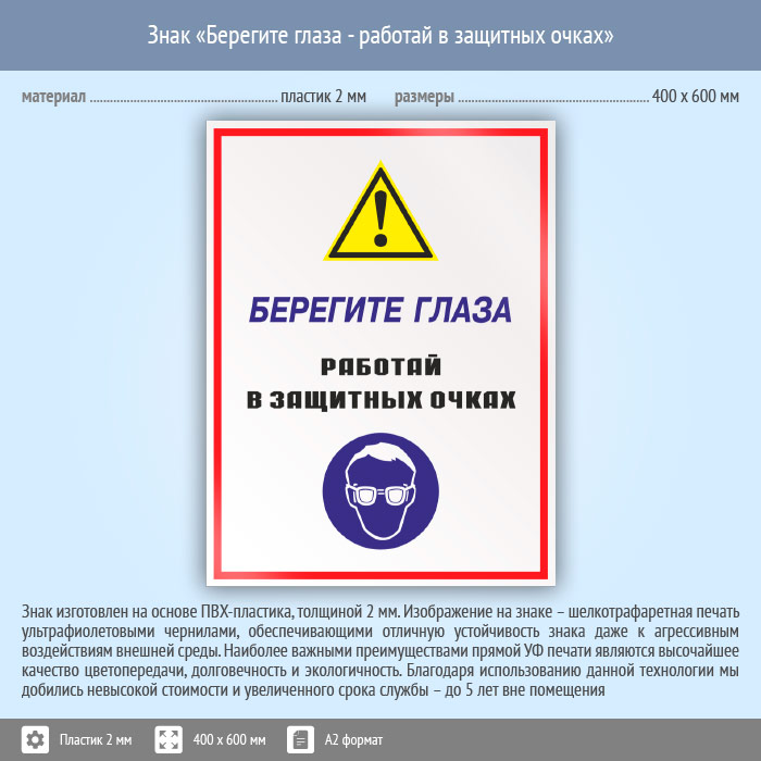 Знак «Берегите глаза - работай в защитных очках», КЗ-04 (пластик, 400х600 мм) в Твери купить