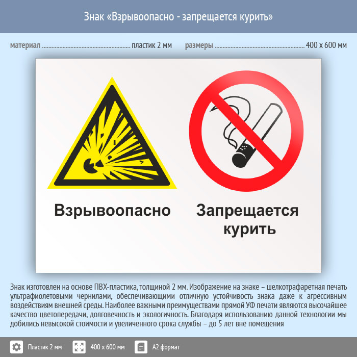 Знак «Взрывоопасно - запрещается курить», КЗ-06 (пластик, 600х400 мм) в Твери купить