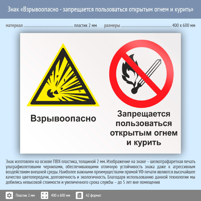 Знак «Взрывоопасно - запрещается пользоваться открытым огнем и курить», КЗ-07 (пластик, 600х400 мм) в Твери купить