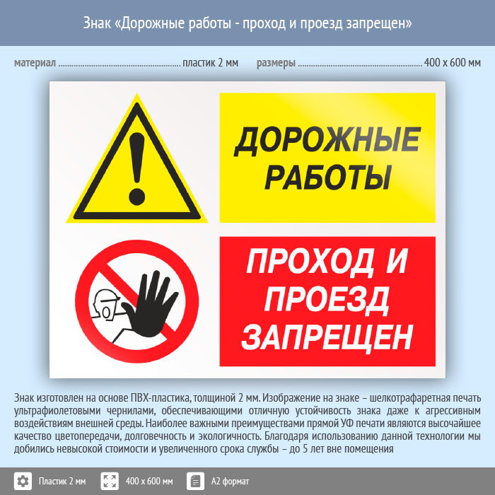Знак «Дорожные работы - проход и проезд запрещен», КЗ-20 (пластик, 600х400 мм) в Твери купить