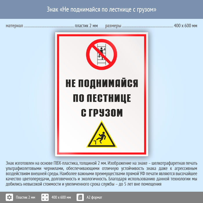 Знак «Не поднимайся по лестнице с грузом», КЗ-28 (пластик, 400х600 мм) в Твери купить