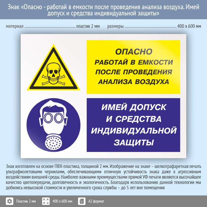 Знак «Опасно - работай в емкости после проведения анализа воздуха. Имей допуск и средства индивидуальной защиты», КЗ-39 (пластик, 600х400 мм) в Твери купить