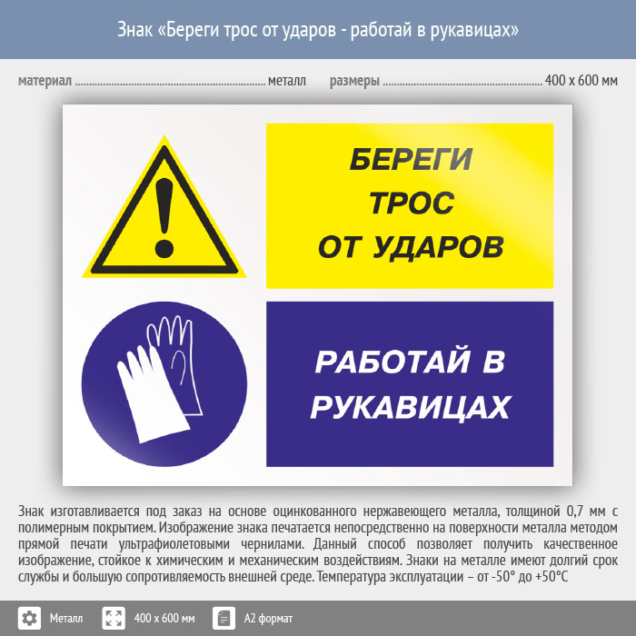 Знак «Береги трос от ударов - работай в рукавицах», КЗ-03 (металл, 600х400 мм) в Твери купить
