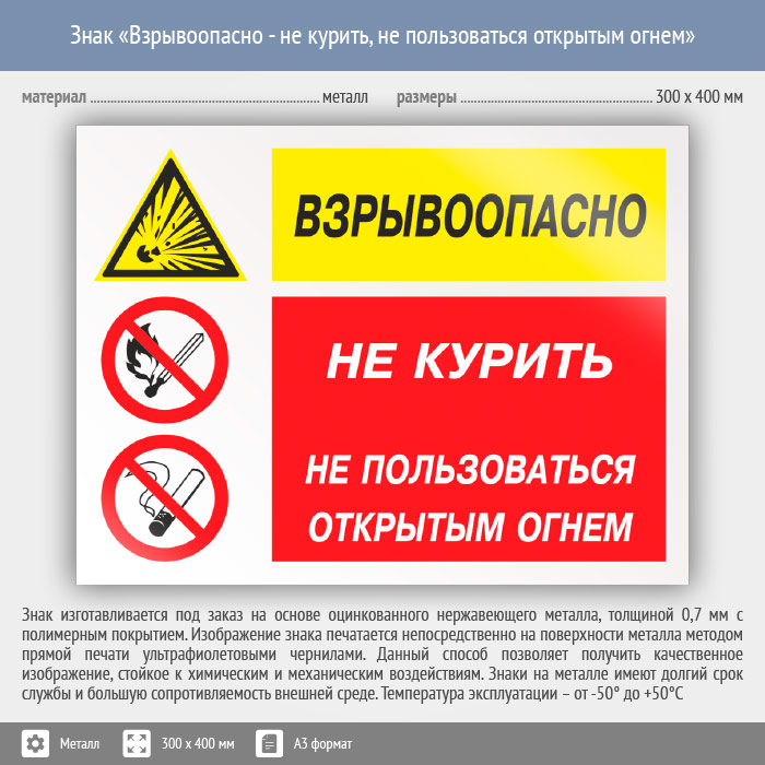Знак «Взрывоопасно - не курить, не пользоваться открытым огнем», КЗ-05 (металл, 400х300 мм) в Твери купить