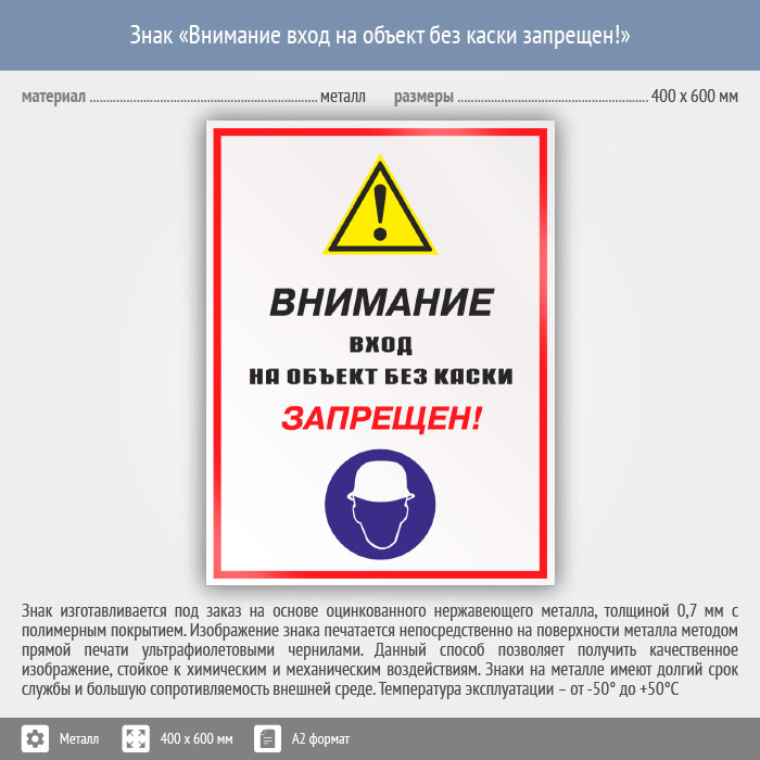 Знак «Внимание вход на объект без каски запрещен!», КЗ-13 (металл, 400х600 мм) в Твери купить