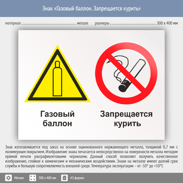 Знак «Газовый баллон. Запрещается курить», КЗ-18 (металл, 400х300 мм) в Твери купить