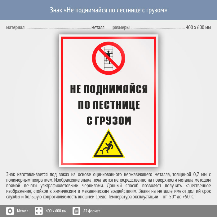 Знак «Не поднимайся по лестнице с грузом», КЗ-28 (металл, 400х600 мм) в Твери купить
