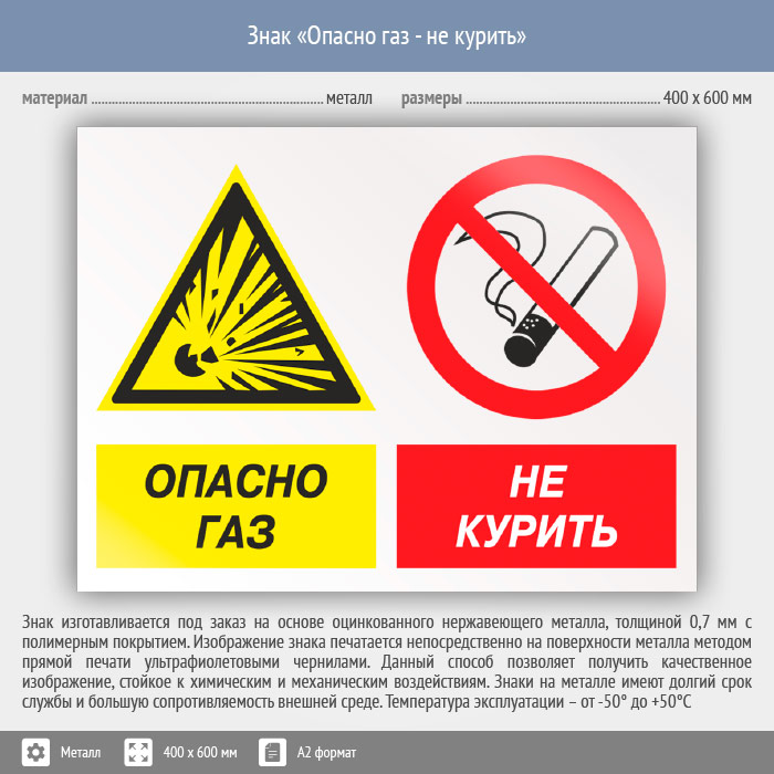 Знак «Опасно газ - не курить», КЗ-44 (металл, 600х400 мм) в Твери купить
