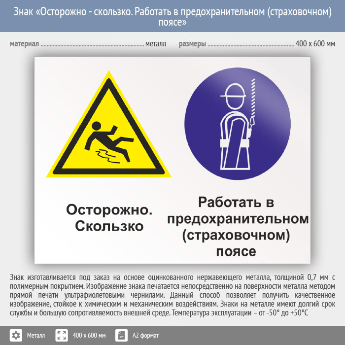 Знак «Осторожно - скользко. Работать в предохранительном (страховочном) поясе», КЗ-58 (металл, 600х400 мм) в Твери купить