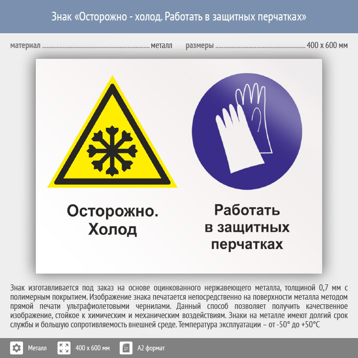 Знак «Осторожно - холод. Работать в защитных перчатках», КЗ-59 (металл, 600х400 мм) в Твери купить