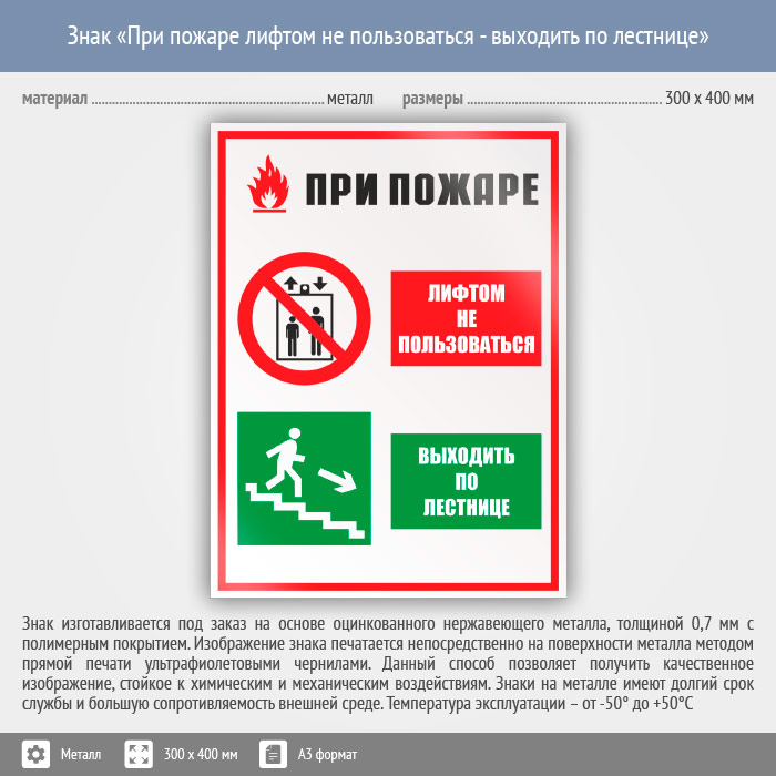 Знак «При пожаре лифтом не пользоваться - выходить по лестнице», КЗ-73 (металл, 300х400 мм) в Твери купить