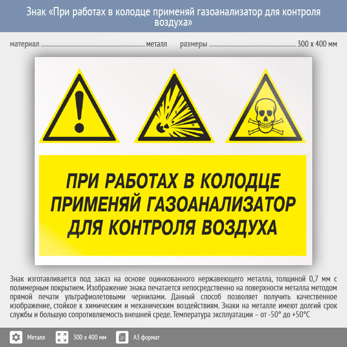 Знак «При работах в колодце применяй газоанализатор для контроля воздуха», КЗ-74 (металл, 400х300 мм) в Твери купить