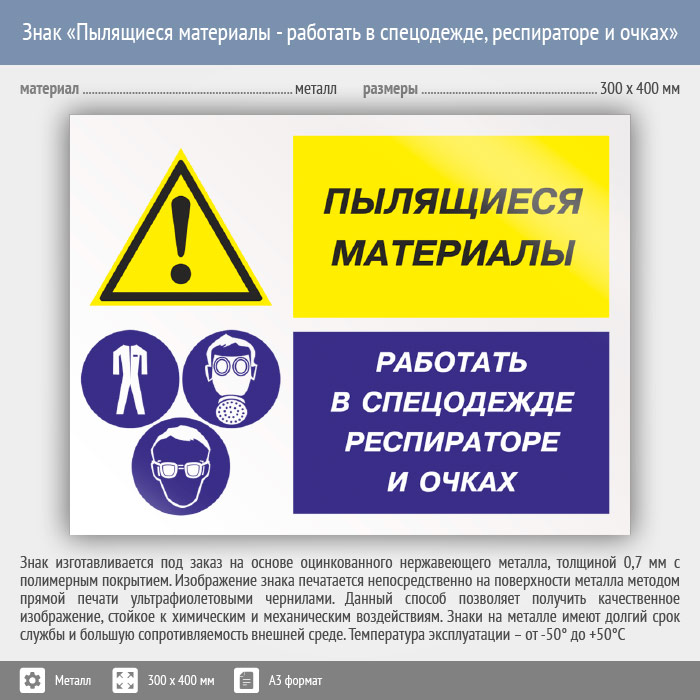 Знак «Пылящиеся материалы - работать в спецодежде, респираторе и очках», КЗ-79 (металл, 400х300 мм) в Твери купить