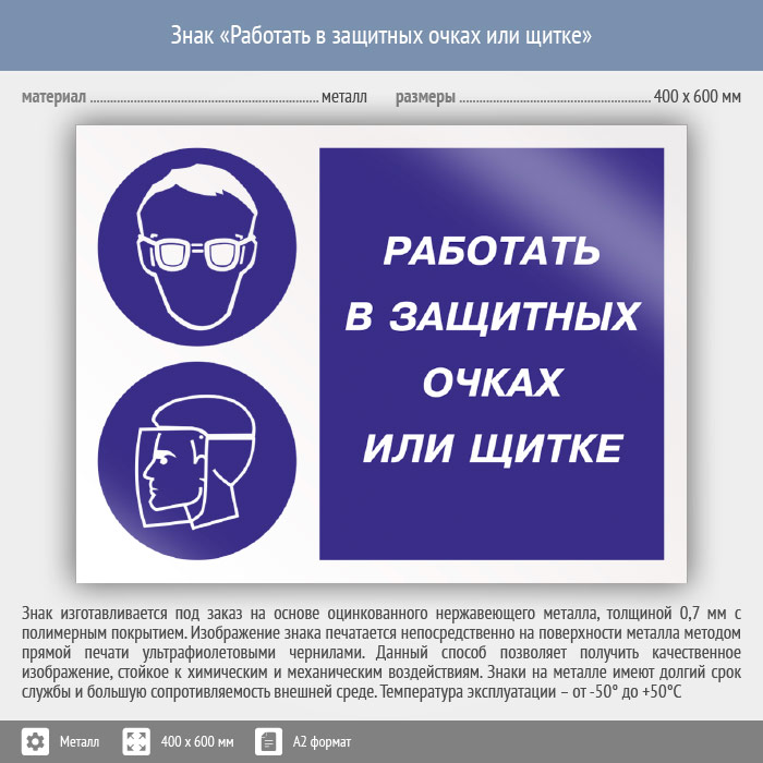Знак «Работать в защитных очках или щитке», КЗ-80 (металл, 600х400 мм) в Твери купить