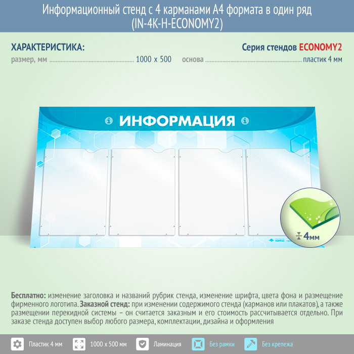 Информационный стенд с 4 карманами А4 формата в один ряд (IN-4K-H-ECONOMY2) в Твери купить