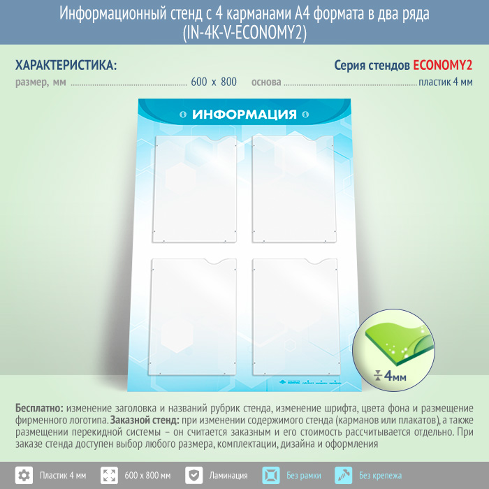 Информационный стенд с 4 карманами А4 формата в два ряда (IN-4K-V-ECONOMY2) в Твери купить