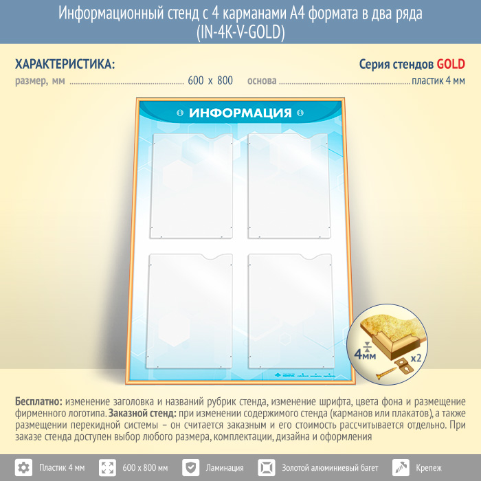 Информационный стенд с 4 карманами А4 формата в два ряда (IN-4K-V-GOLD) в Твери купить
