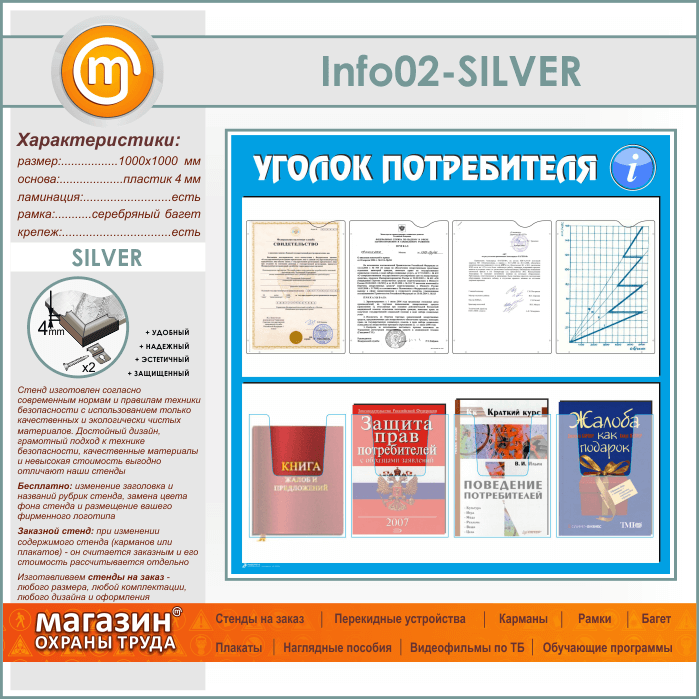 Стенд «Уголок потребителя» с 4 плоскими и 4 объемными карманами А4 формата (IN-02-SILVER) в Твери купить