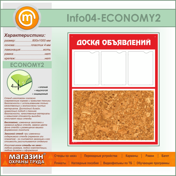 Стенд «Доска объявлений» с пробковым полотном и 3 карманами А4 формата (IN-04-ECONOMY2) в Твери купить