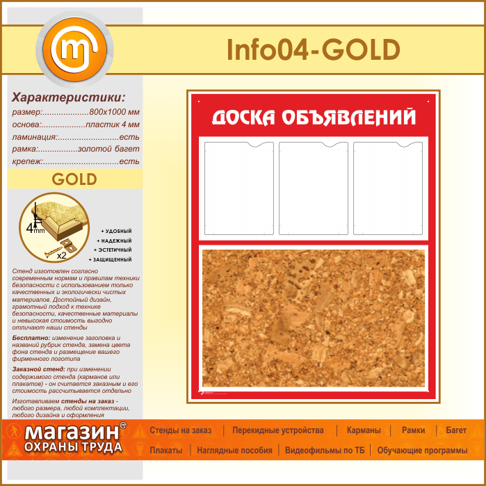 Стенд «Доска объявлений» с пробковым полотном и 3 карманами А4 формата (IN-04-GOLD) в Твери купить