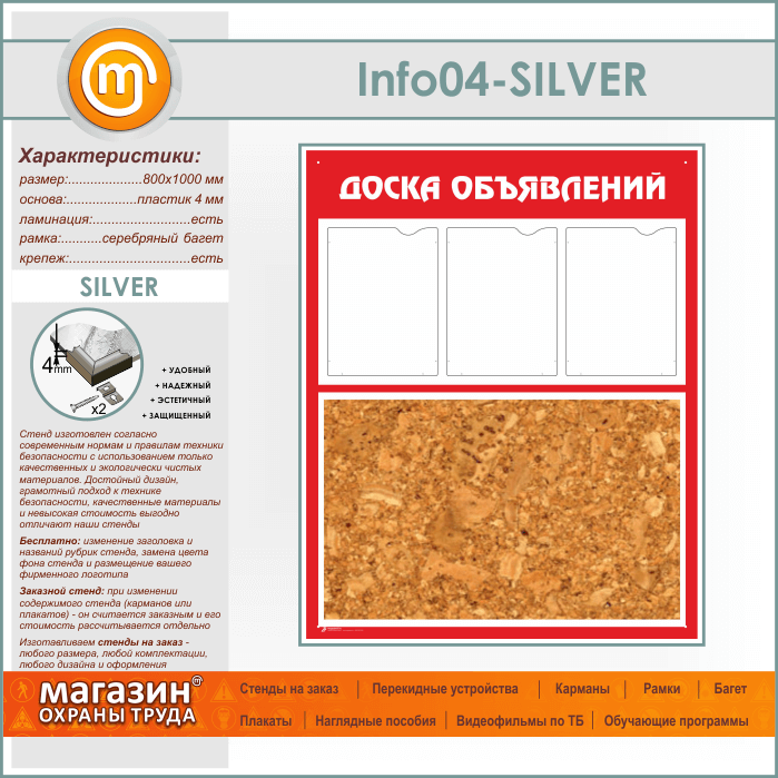 Стенд «Доска объявлений» с пробковым полотном и 3 карманами А4 формата (IN-04-SILVER) в Твери купить
