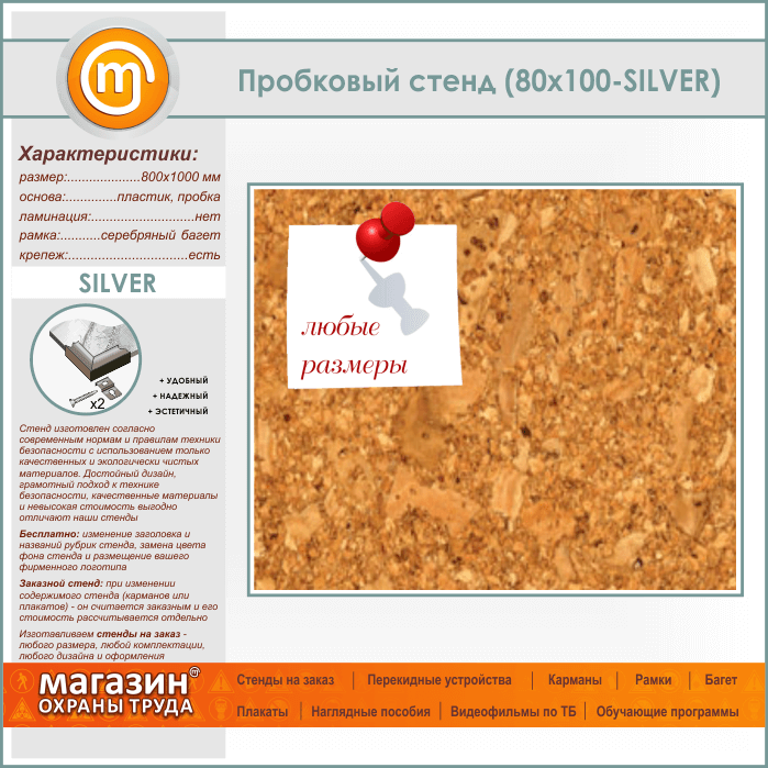 Пробковая доска, 100х80 см (IN-05-SILVER) в Твери купить