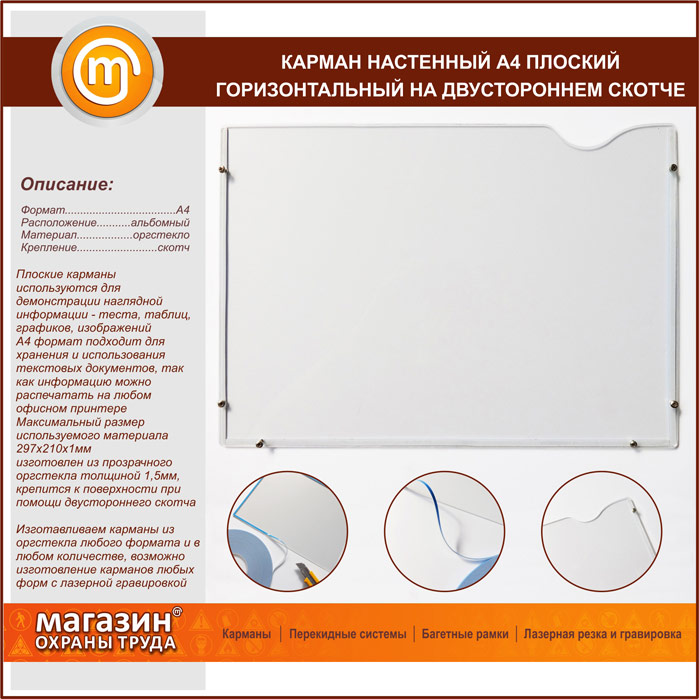Карман настенный А4 плоский горизонтальный на двустороннем скотче в Твери купить