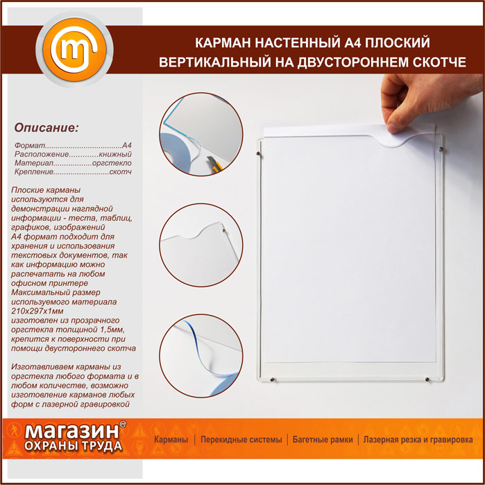 Карман настенный А4 плоский вертикальный на двустороннем скотче в Твери купить