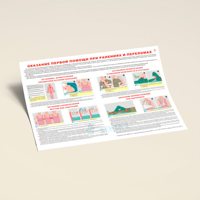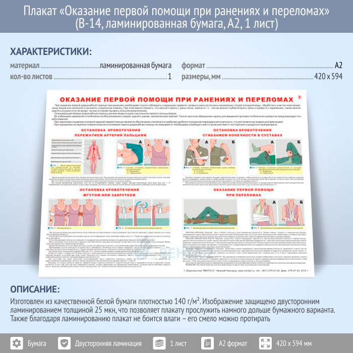 Плакат «Оказание первой помощи при ранениях и переломах» (В-14, ламинированная бумага, А2, 1 лист) в Твери купить