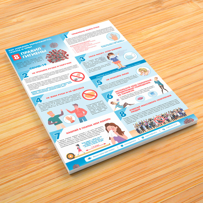 Плакат «Восемь правил гигиены. Как избежать коронавируса, гриппа и ОРВИ» (М-28, ламинированная бумага, А3, 1 лист) в Твери купить