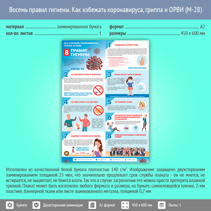 Плакат «Восемь правил гигиены. Как избежать коронавируса, гриппа и ОРВИ» (М-28, ламинированная бумага, А2, 1 лист) в Твери купить