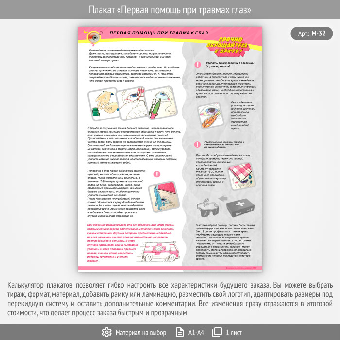 Плакат «Первая помощь при травмах глаз» (М-32, 1 лист) в Твери купить
