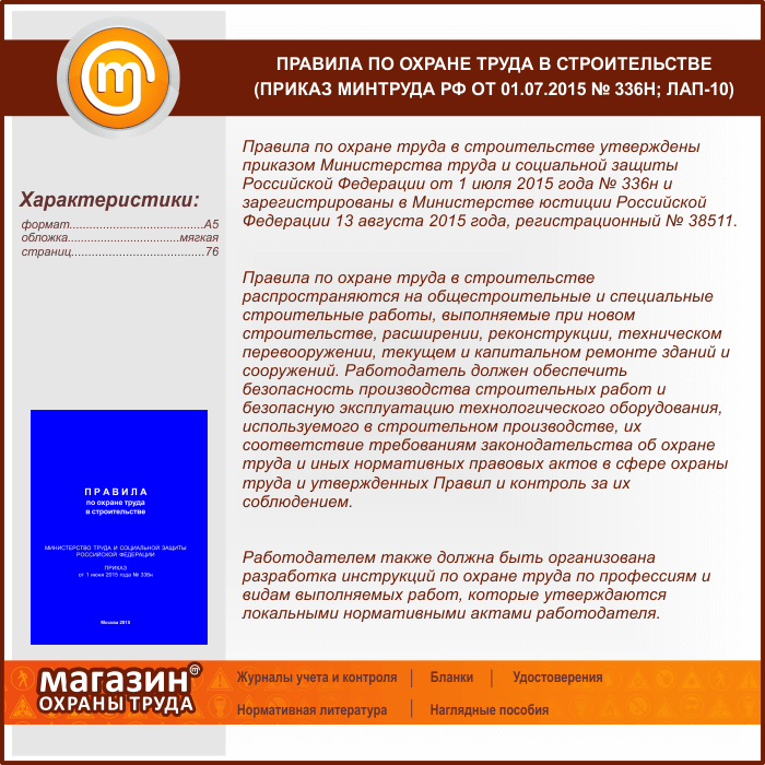 Правила по охране труда в строительстве (Приказ Минтруда РФ от 01.07.2015 № 336н) (ЛАП-10) в Твери купить