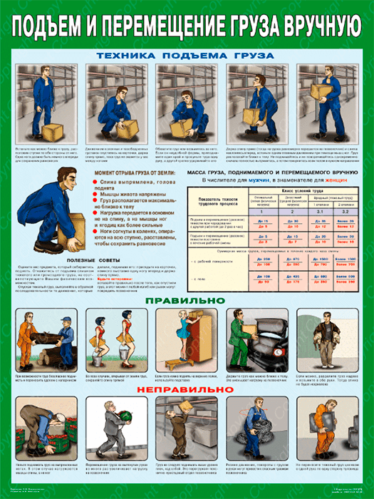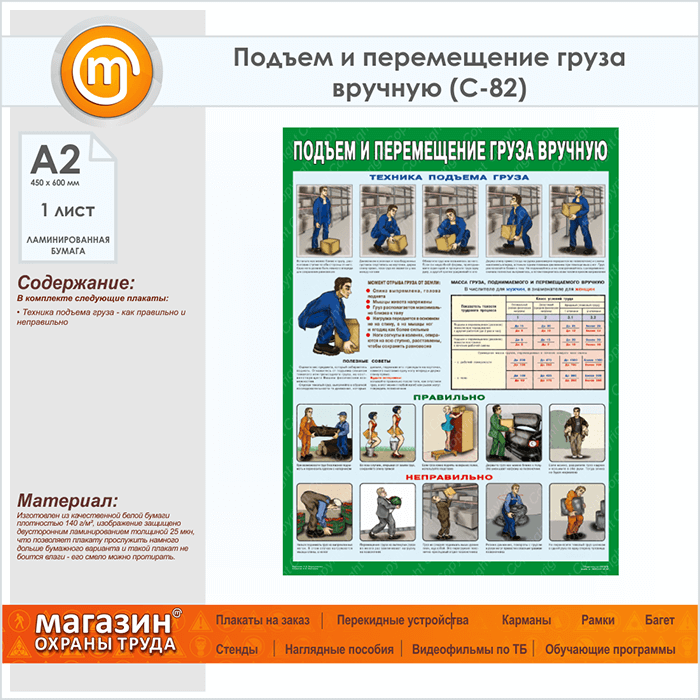 Плакат «Правила перемещения грузов вручную» (С-82, ламинированная бумага, А2, 1 лист) в Твери купить