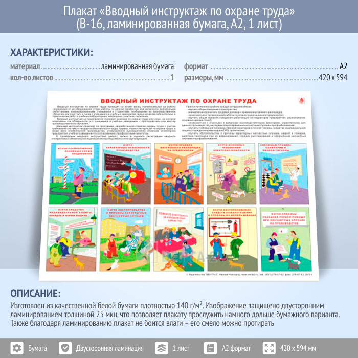 Плакат «Вводный инструктаж по охране труда» (В-16, ламинированная бумага, А2, 1 лист) в Твери купить