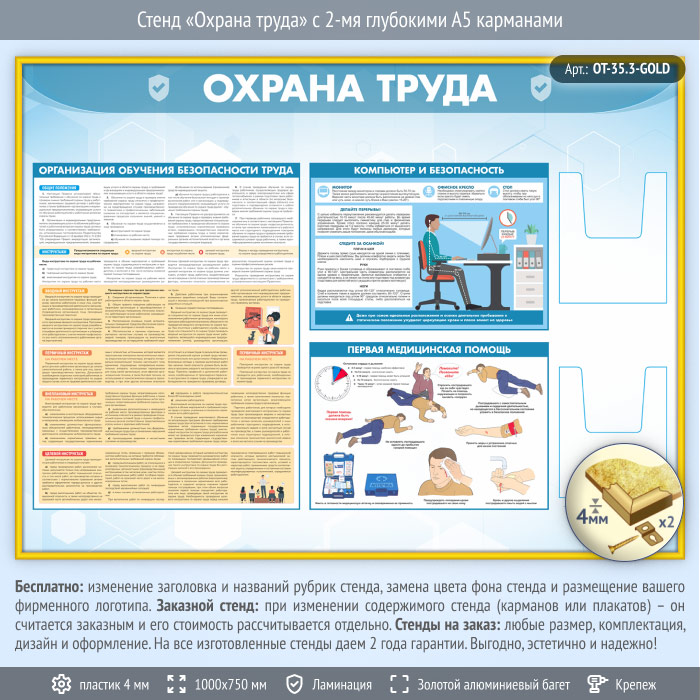 Стенд «Охрана труда» с 2-мя глубокими А5 карманами (OT-35.3-GOLD) в Твери купить
