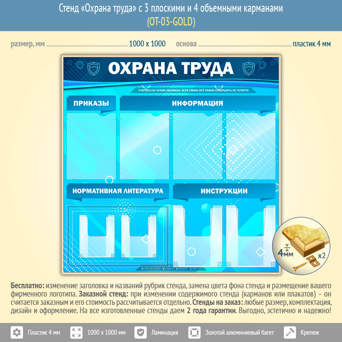 Стенд «Охрана труда» с 4 плоскими и 4 объемными карманами (OT-03-GOLD) в Твери купить