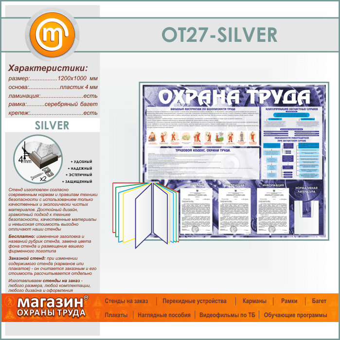 Стенд «Охрана труда» с перекидной системой, 3 плоскими и 1 объемным карманом (OT-27-SILVER) в Твери купить