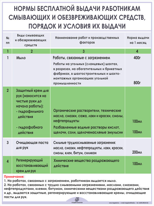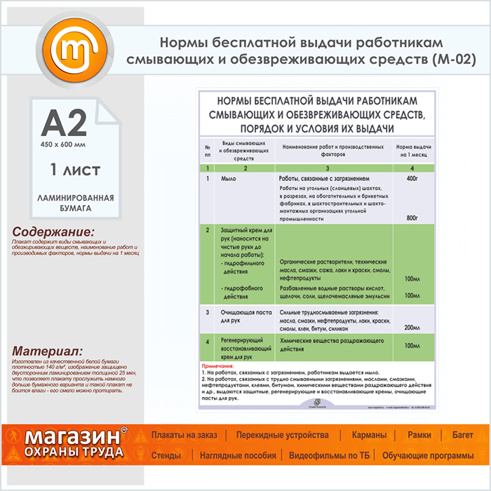 Плакат «Нормы бесплатной выдачи работникам смывающих и обезвреживающих средств» (М-02, ламинированная бумага, А2, 1 лист) в Твери купить