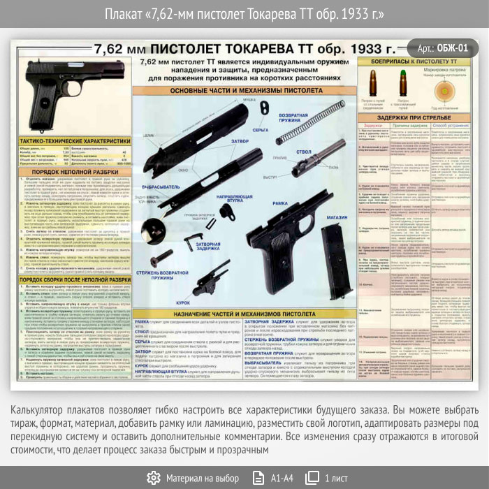 Плакат «7,62-мм пистолет Токарева ТТ обр. 1933 г.» (ОБЖ-01, 1 лист) в Твери купить