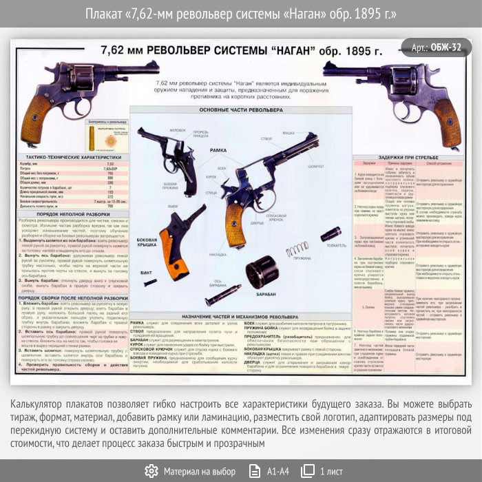 Плакат «7,62-мм револьвер системы «Наган» обр. 1895 г.» (ОБЖ-32, 1 лист) в Твери купить