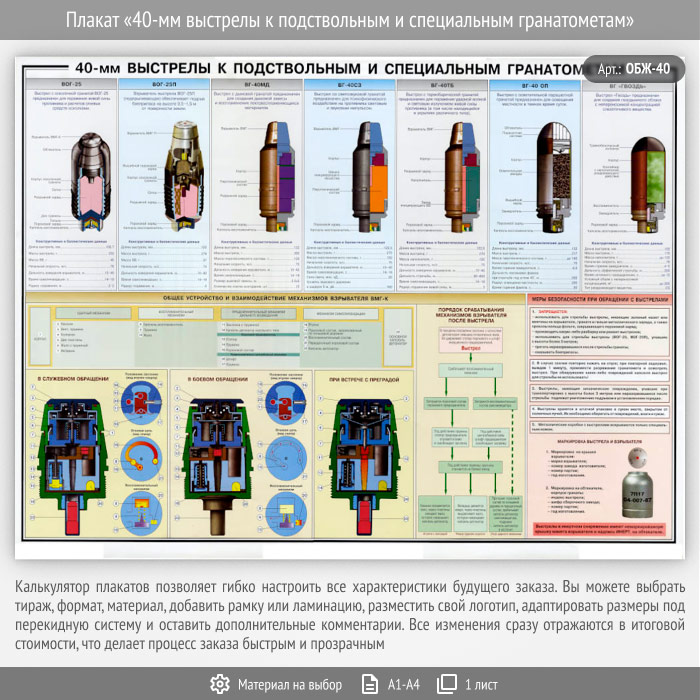 Плакат «40-мм выстрелы к подствольным и специальным гранатометам» (ОБЖ-40, 1 лист) в Твери купить